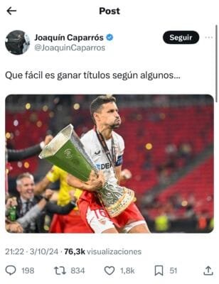 El utrerano se encarga de hacer su tradición de calentar el derbi, apelando a “qué fácil es ganar títulos según algunos…” justo al acabar el partido de hoy del Betis, dando a entender que los verdiblancos no son capaces de competir en Europa.