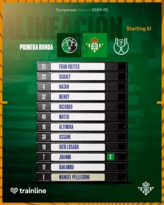 El once del Betis es el siguiente: Vieites, Sabaly, Natan, Mendy, Ricardo Rodríguez, Altimira, Mateo, Losada, Assane, Juanmi y Bakambu.