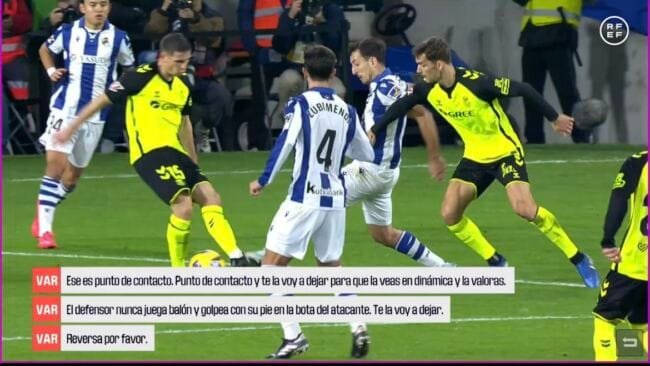 “El defensor nunca juega balón y golpea con su pie en la bota del atacante”, son las palabras de Del Cerro Grande antes de que el árbitro de campo revise la acción por sí mismo en el monitor.