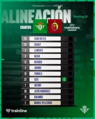 El once está formado por Vieites, Sabaly, Natan, Llorente, Ricardo Rodríguez, Cardoso, Fornals, Isco, Antony, Jesús Rodríguez y Bakambu.