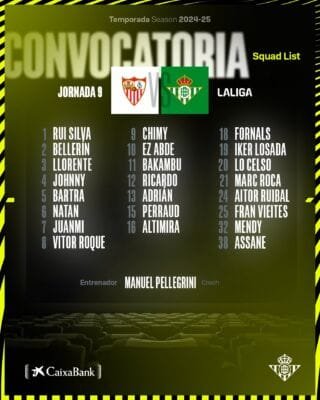 Siguen fuera del equipo los lesionados de mayor duración Isco, Carvalho y Sabaly, que todo apunta a que volverá tras este próximo parón de selecciones.