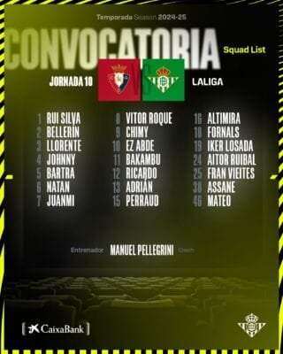 Son cuatro las ausencias que tendrá para la medular por las lesiones de Isco, Sabaly, Lo Celso, Carvalho y Marc Roca. Sí están citados Chimy y Natan, que han superado los problemas físicos que tuvieron los últimos días.