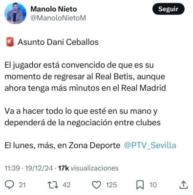 De cara al próximo mercado invernal, el jugador tiene claro que quiere volver al Betis, según informa el periodista Manolo Nieto. Además, añade que hará todo lo posible para que pueda darse su llegada.