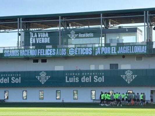La sesión ha estado protagonizada por la colocación de una lona en la Ciudad Deportiva con la frase: “Sigamos haciendo felices a los béticos. A por el Jagiellonia”.
