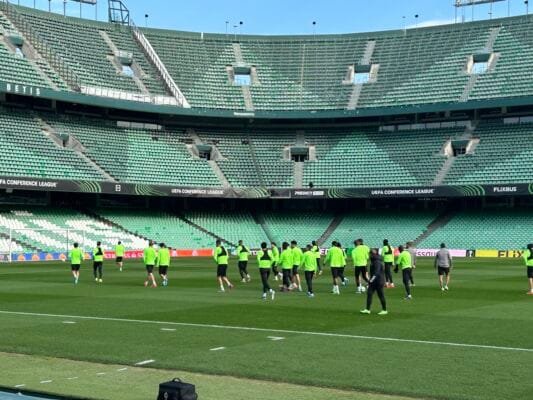 Última sesión de entrenamiento del Betis en la previa del duelo de Conference League ante el Helsinki. Los verdiblancos buscarán una victoria que garantice su presencia en la siguiente ronda.
