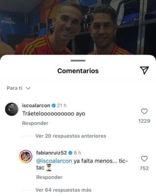 La pasada noche hubo otro gesto que hace ver que el jugador lo tiene bastante claro. En la publicación de Instagram que subió el Betis con Ayoze y Fabián, Isco comentó “Tráetelo Ayo”. El centrocampista respondió “ya falta menos… tic tac” y ha sembrado todos los rumores en las redes.