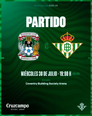 El Betis jugará el próximo miércoles 30 de julio un encuentro ante el Coventry, durante su stage en el país británico. El partido se disputará a las 19:00 horas.