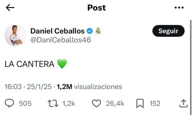 Mientras tanto, Ceballos sigue estando muy pendiente de la actualidad bética. Tras la victoria en Mallorca, el utrerano dejó un mensaje en sus redes sociales recalcando el papel de la cantera.