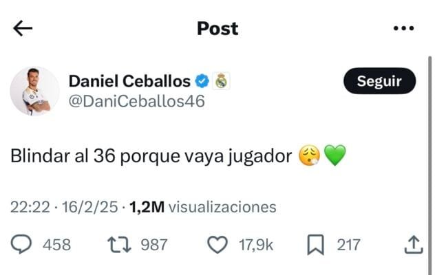 Ceballos pidió al club bético que anclen al canterano, alabando el nivel que está mostrando con el primer equipo. “Blindar al 36 porque vaya jugador” fue el mensaje que publicó.
