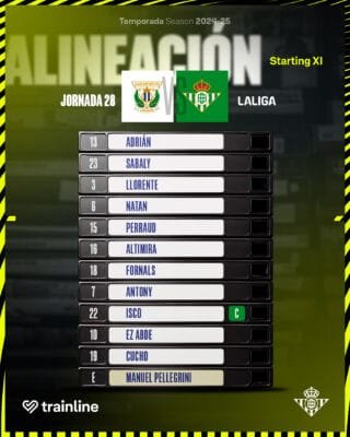 El once está formado por Adrián, Sabaly, Llorente, Natán, Perraud, Altimira, Fornals, Isco, Antony, Abde y Cucho Hernández.