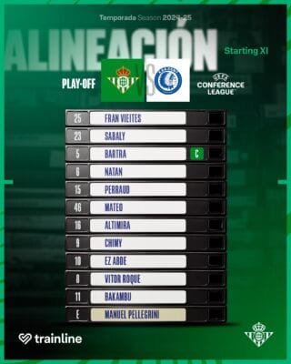 El once del Betis está formado por Vieites, Sabaly, Bartra, Natan, Perraud, Altimira, Mateo, Chimy, Abde, Vitor Roque y Bakambu.