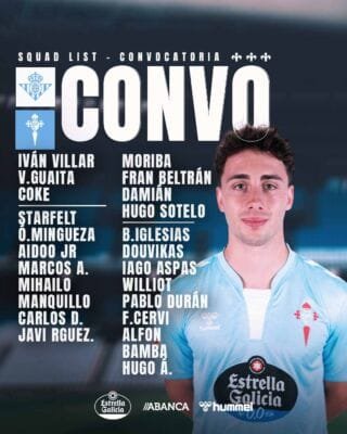 El técnico celeste ha recuperado para el choque ante los verdiblancos a Pablo Durán y Williot, que han recibido el alta médica esta misma semana. Sigue teniendo como bajas a Luca de la Torre, Jailson y Sergio Carreira.