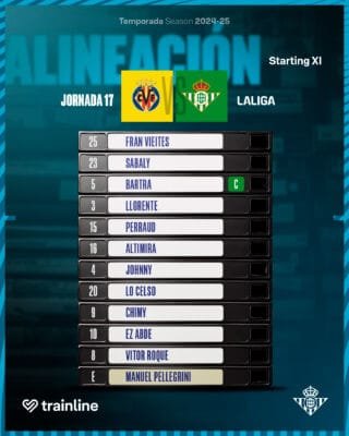 El mediocentro entra en lugar de Mateo Flores, que se queda en el banquillo. Pellegrini repite el resto de la alineación, con la vuelta de Bartra, Sabaly, Perraud, Altimira, Abde y Vitor Roque al once.