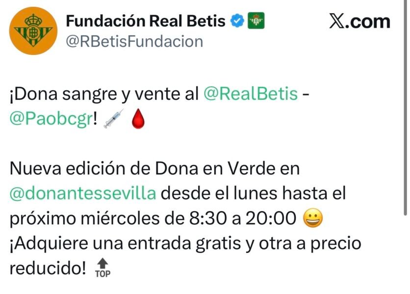 Bajo el lema «Dona en Verde», el Real Betis, en colaboración con el Centro de Transfusión, Tejidos y Células de Sevilla, regalará entradas para el trascendental choque europeo a quienes acudan a donar sangre. Una medida que une la necesidad social con la urgencia deportiva de un equipo en horas bajas.
