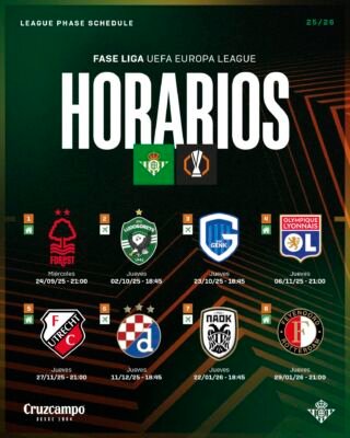 Los verdiblancos comenzarán recibiendo en la Cartuja al Nottingham Forest, antes de tener dos partidos a domicilio ante Ludogorets y Genk. Tras ello, recibirán a Lyon y Utrecht.