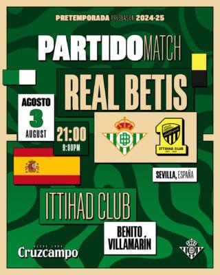 El Betis ha confirmado en sus medios oficiales que el encuentro de presentación en el Villamarín, para el que todos los abonados tendrán acceso con su carnet, será el próximo 3 de agosto ante el Al Ittihad.