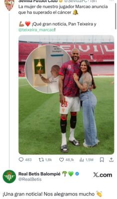 Por su parte, el Betis respondió al mismo con el siguiente texto: “¡Una gran noticia! Nos alegramos mucho 👏”. Una muestra de que los colores en estos asuntos no importan.