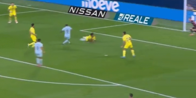 El zaguero amarillo se lanzó al suelo y evitó el gol del colombiano de una manera poco natural. En la repetición se ve que el balón golpea en la mano del jugador del Villarreal, sin que fuera revisado por el VAR.