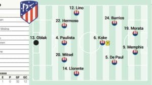 Los colchoneros tienen las bajas de Giménez, Lemar, Azpilicueta y Griezmann. Pese al esfuerzo del jueves, no se esperan muchas rotaciones en el equipo del Cholo, que prioriza la Liga por encima de cualquier otra competición. Éste es, según la prensa, el posible once del club rojiblanco.