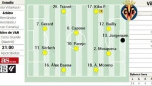 El conjunto amarillo viene de un desgaste físico y mental por el varapalo europeo. Marcelino no hizo muchas rotaciones respecto al anterior encuentro liguero. Podría apostar por el siguiente once inicial.