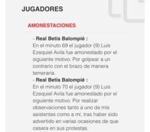 Hernández Hernández recogió en el acta que fue amonestado por «golpear a un contrario con el brazo de manera temeraria”. La segunda amarilla por «realizar observaciones tanto a uno de mis asistentes como a mí, tras haber sido advertido en varias ocasiones de que cesara en sus protestas»