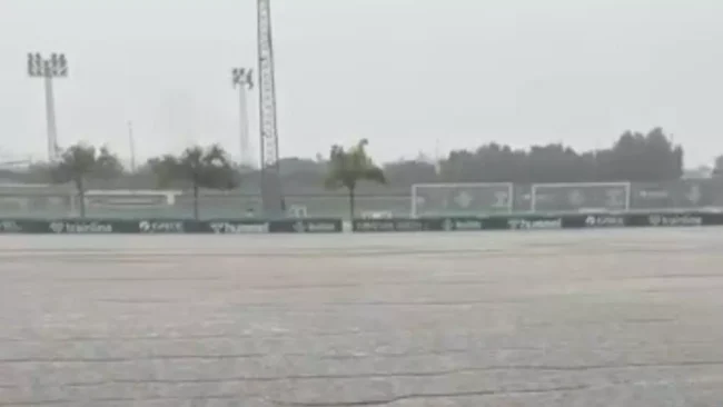 Este temporal también ha hecho mella en la Ciudad Deportiva bética, donde el equipo se ha ejercitado esta mañana para preparar el choque de este jueves ante el Palma del Río.