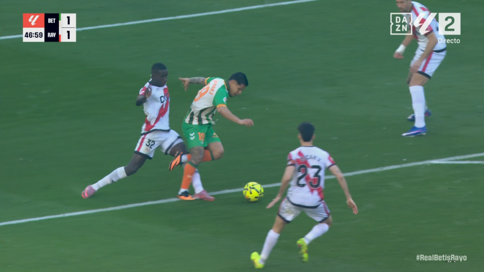 Todo pudo ser muy distinto al inicio de la segunda parte en La Cartuja. En una llegada clara del Betis, Cucho Hernández cae dentro del área tras un contacto evidente con Nobel Mendy.