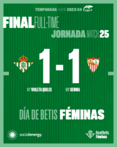 Una situación similar se ha visto en el derbi femenino. Las verdiblancas iban ganando el encuentro que les alejaba notablemente del descenso, pero el Sevilla igualó el partido en el último minuto. No es del todo negativo, puesto que el equipo que marca el descenso (Villarreal) ha perdido y han sacado un punto más a la zona roja.