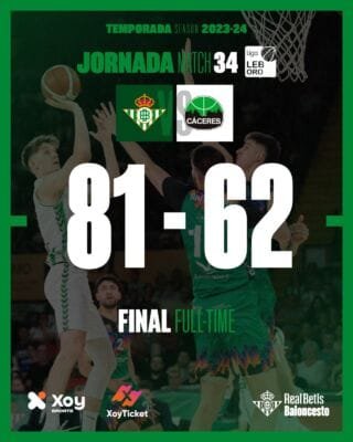 ⏱️4Q – 00:00@RealBetisBasket 81@Caceres_Basket 62#RealBetisBaloncestoCáceres #SeClavaEnElCorazón #BetisBaloncesto pic.twitter.com/yyKLh8YUQY— Real Betis Baloncesto (@RealBetisBasket) May 10, 2024