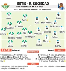 Un total de siete bajas tendrá Pellegrini, destacando las de jugadores importantes como Isco, Guido o Pezzella. Imanol solamente tendrá cuatro bajas, dos de ellas importantes como Zubeldia y Zubimendi. Estos podrían ser los onces iniciales de ambos equipos.
